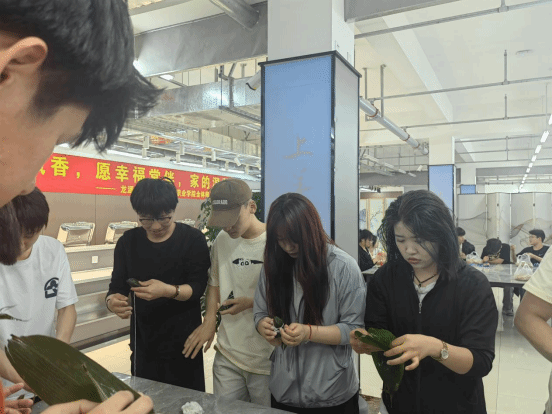 在我校东区食堂,我院师生们齐聚一堂,共同参与传统粽子的制作过程。活动现场提供了丰富的粽子材料,让参与者可以根据自己的口味自由选择搭配。在老师们的指导下,师生们纷纷动手尝试,从挑选粽叶、填充馅料到捆扎成型,每一步都充满了乐趣与成就感。
