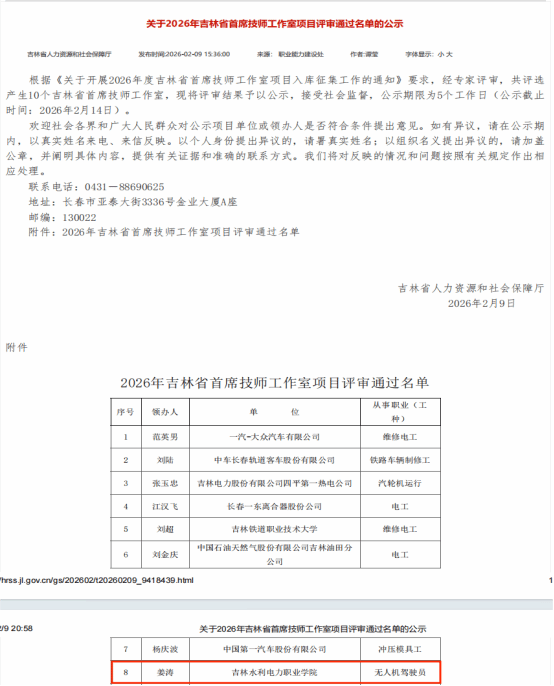 近日,吉林省人力资源和社会保障厅评选结果公示,我院姜涛老师领衔的工作室成功获评“姜涛无人机驾驶员吉林省首席技师工作室”,这是我院在高技能人才培养领域的又一重大突破,更是对我院低空经济相关专业建设实力的高度认可与有力彰显!